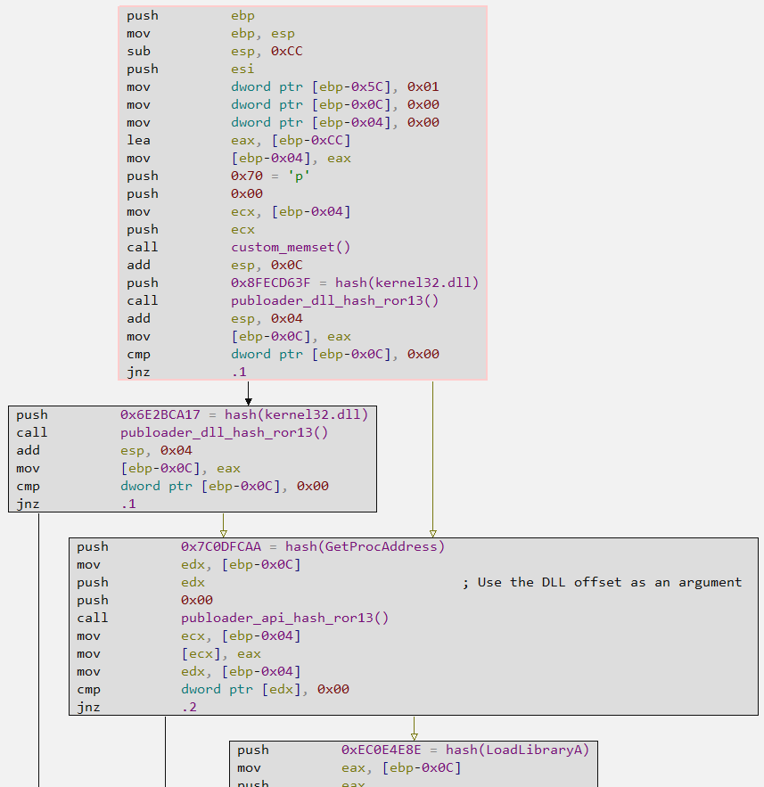 The first action of Publoader’s Main function is to resolve kernel32.dll in two ways. To ensure the DLL is resolved and finally loaded, it attempts to resolve it using two hashes (6E2BCA17 and 8FECD63F), a critical step for the rest of the code. When resolving kernel32.dll through the publoader_dll_hash_ror13 function, the GetProcAddress and LoadLibraryA APIs are also resolved through the publoader_api_hash_ror13 function.