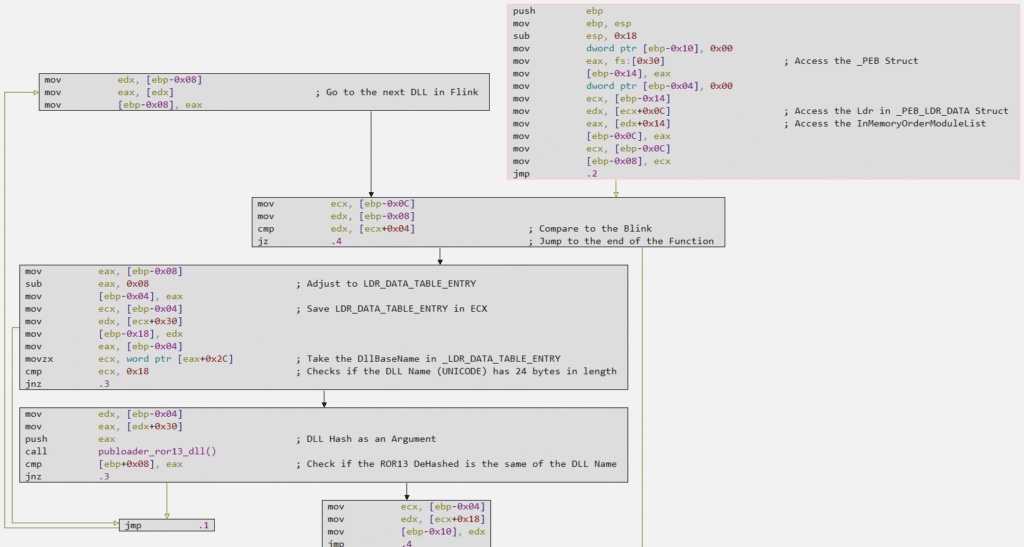 When analyzing the publoader_dll_hash_ror13 function, we can observe that Publoader uses the PEB Walking technique, where the PEB structure is accessed in a loop to collect the name of each module, where each name will be submitted to the ROR13 hash algorithm, and finally compared if the Hash resulting from the function will match one of the hashes previously identified, which were placed as arguments for this function.