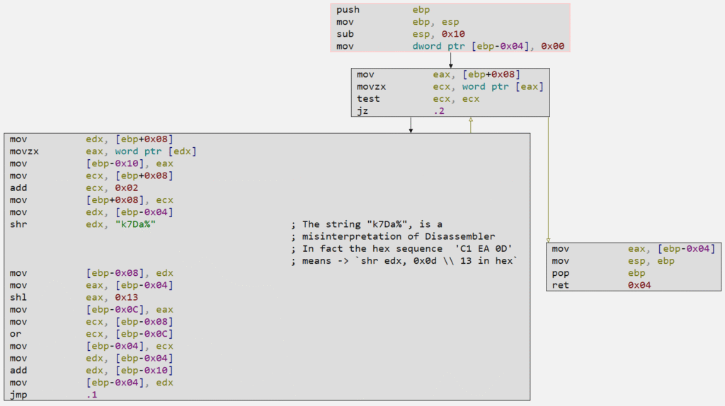 In the image below, we are able to validate that the algorithm used is in fact ROR13, through the identification of logical operations, mainly referring to shr edx, 0x0d.