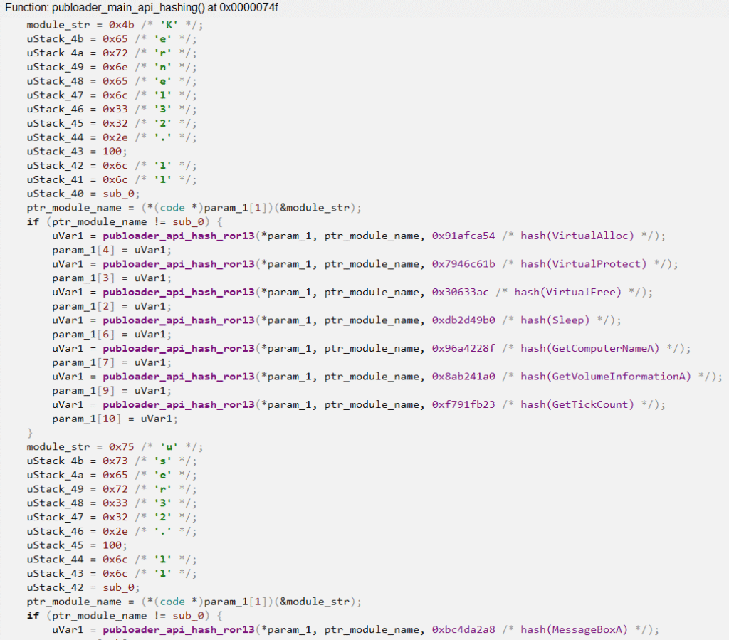 Publoader also implements a long API loading function through API Hashing, as we can see in the image below.