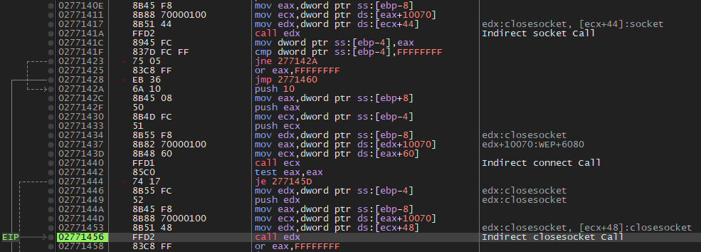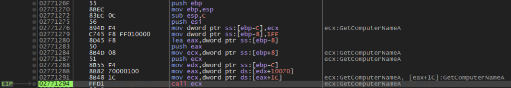And finally, after loading all the necessary DLLs, the Shellcode executes them indirectly, with the aim of collecting information from the device and sending it to the command and control server, as we can see in the following sequence of images in x32dbg.